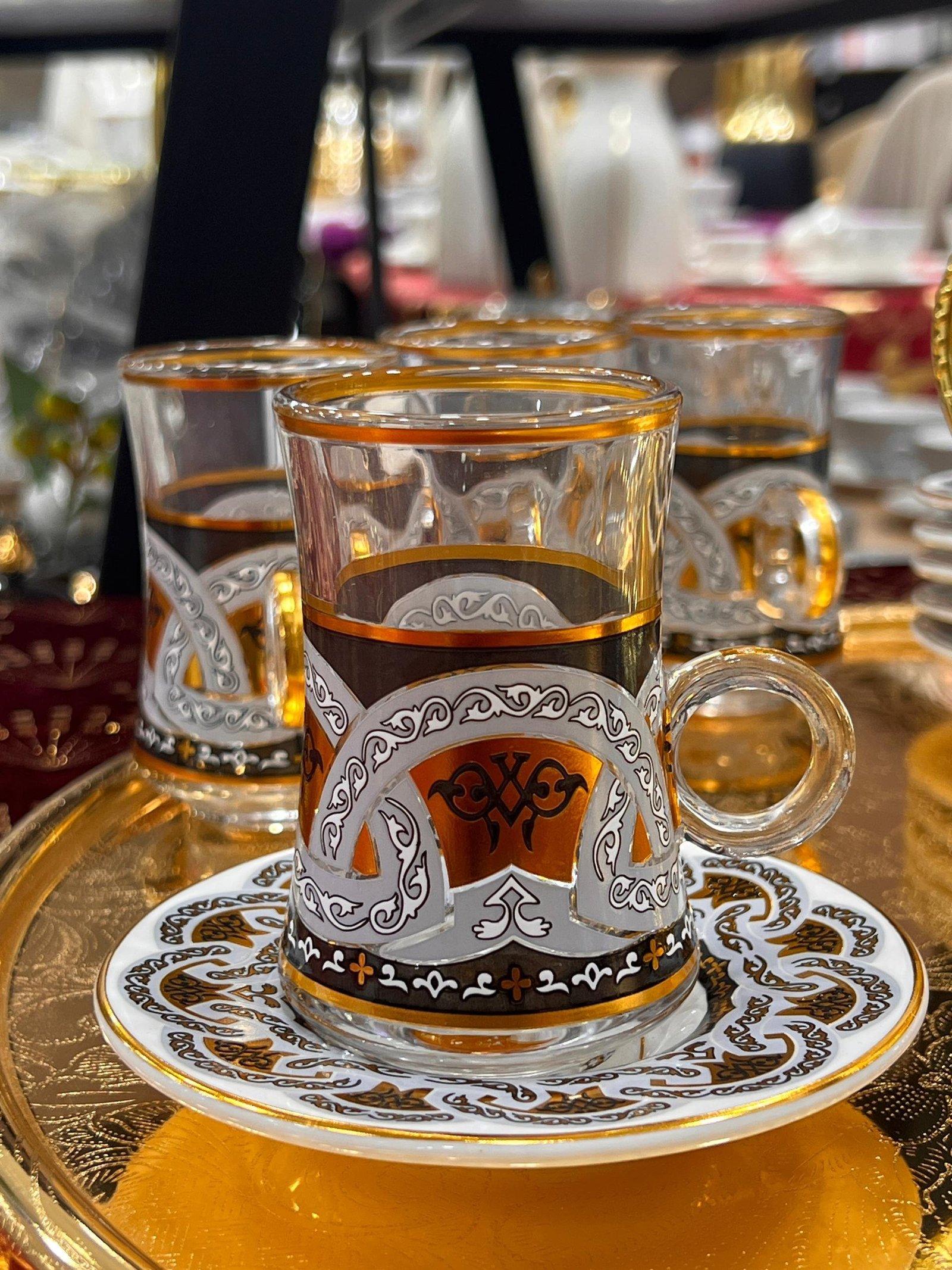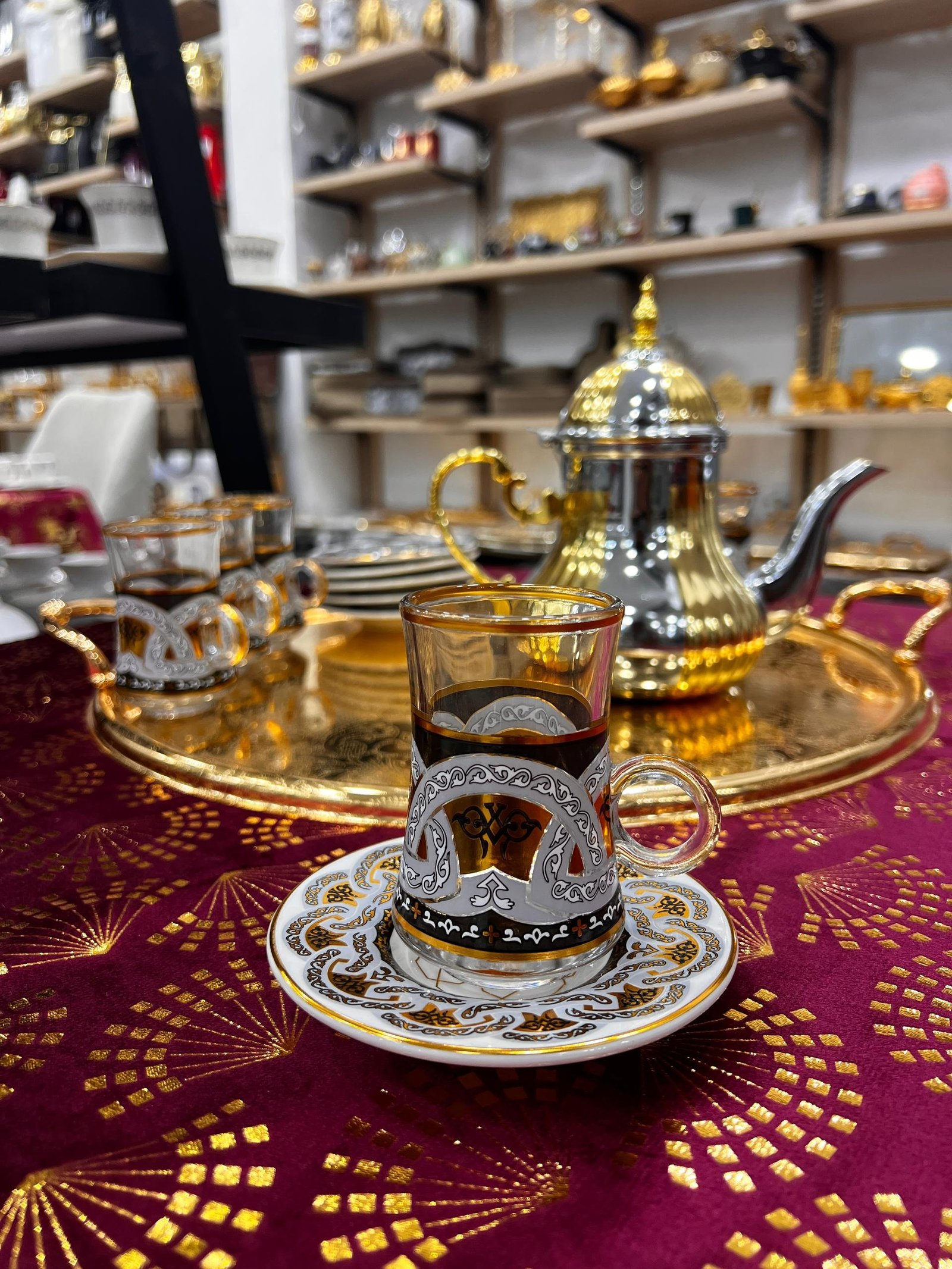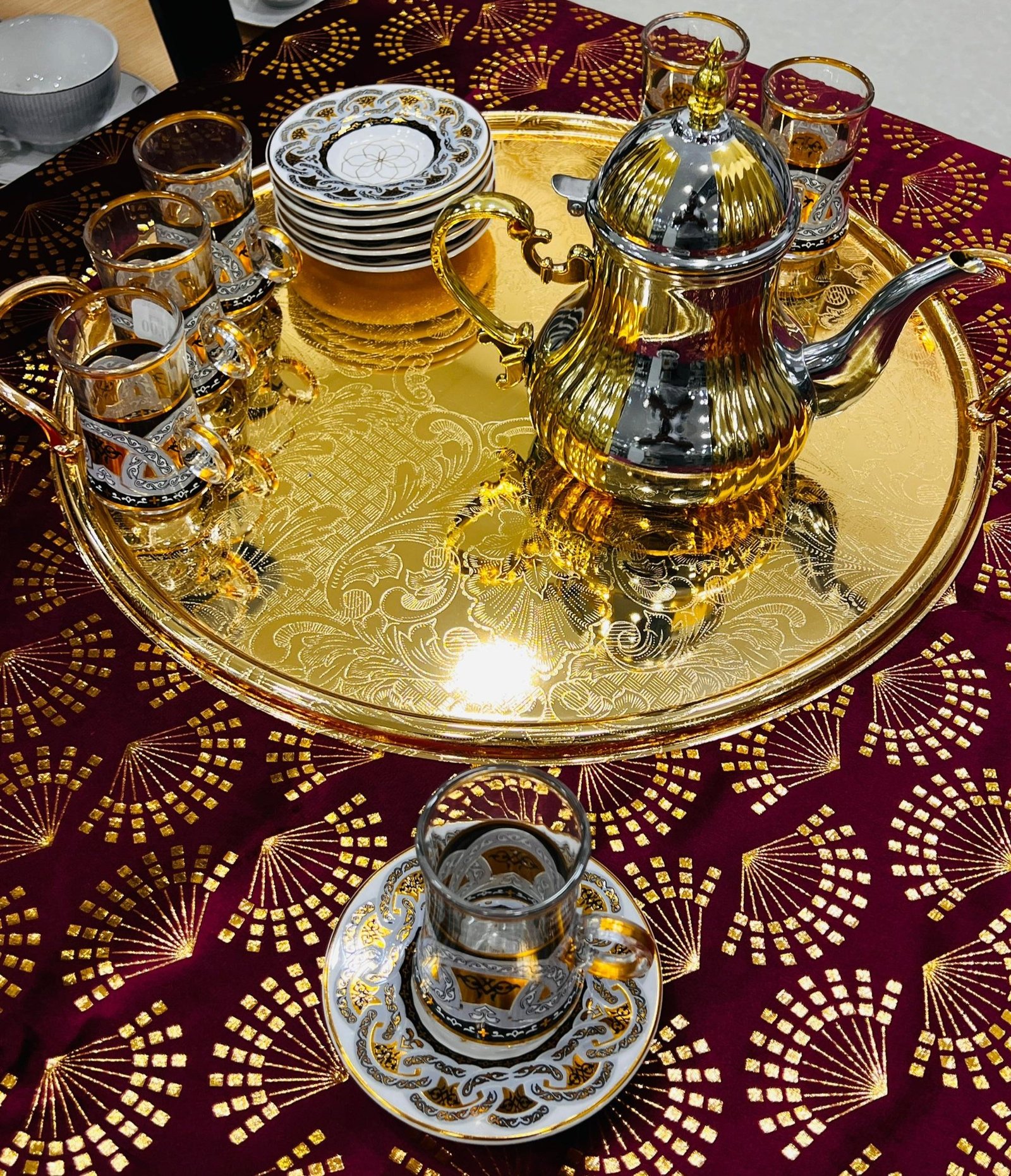 يتكوّن من صينية ذهبية منقوشة بتصميم فاخر، إبريق معدني لامع يجمع بين الفضة والذهب، وأكواب زجاجية محاطة بزخارف فنية أنيقة مع صحون مطابقة تزيد من روعة التقديم.
