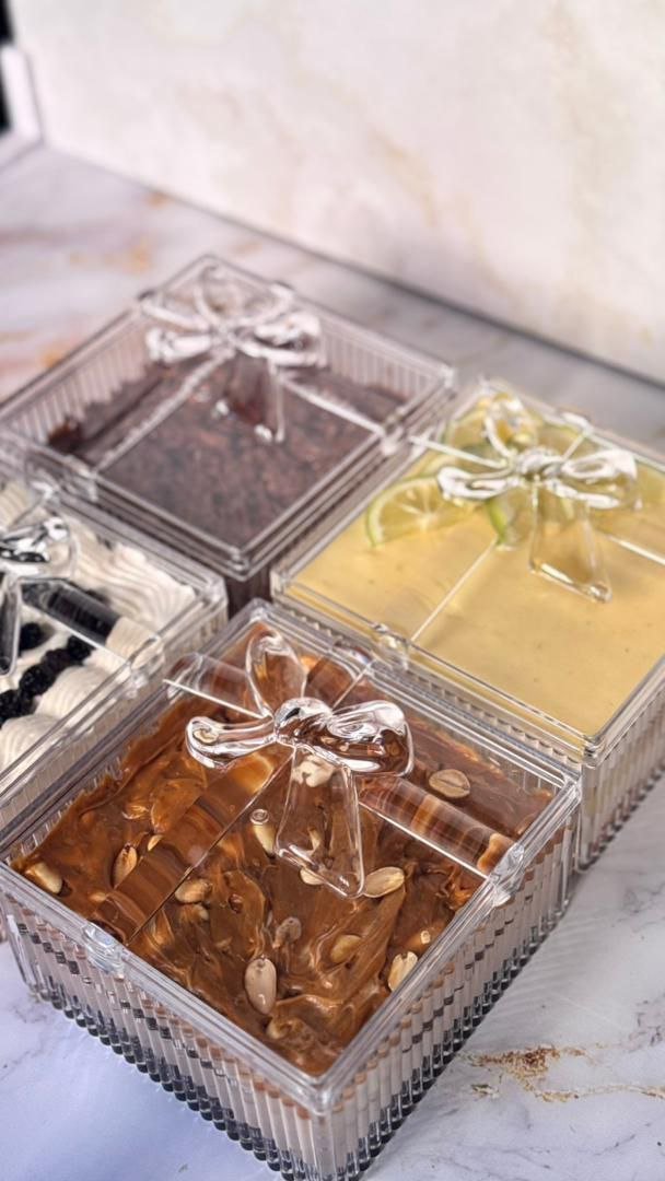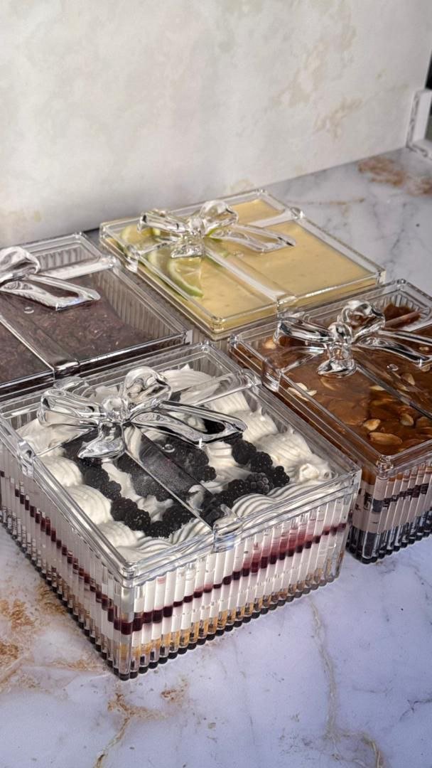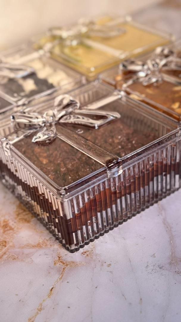 اجعلي كل لحظة ضيافة تبدو وكأنها احتفال صغير مع علب التقديم الكريستالية بتصميم الفيونكة الفاخر!